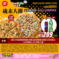 必勝客比薩 10/28~12/20 外帶13吋鬆厚比薩(2選1)只要$199,另享10元加購可樂/七喜