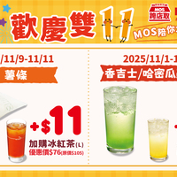 摩斯漢堡 11/9~11/11 歡慶雙11 買薯條享紅茶加購價11元、11/1~11/15 指定蘇打加11元多一杯